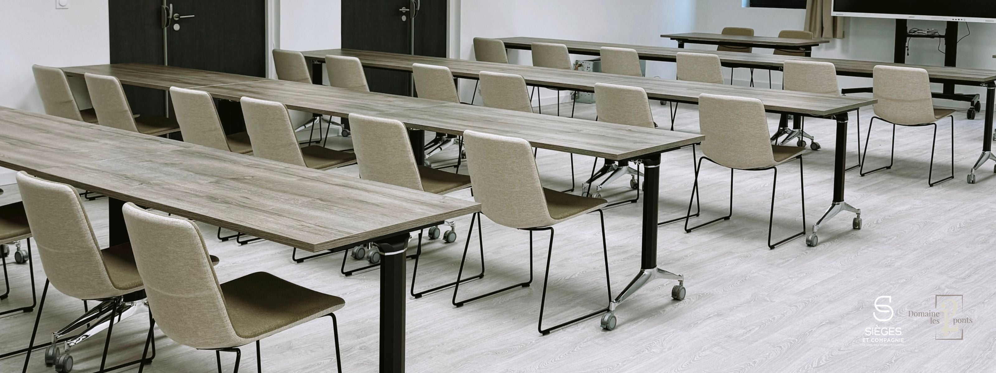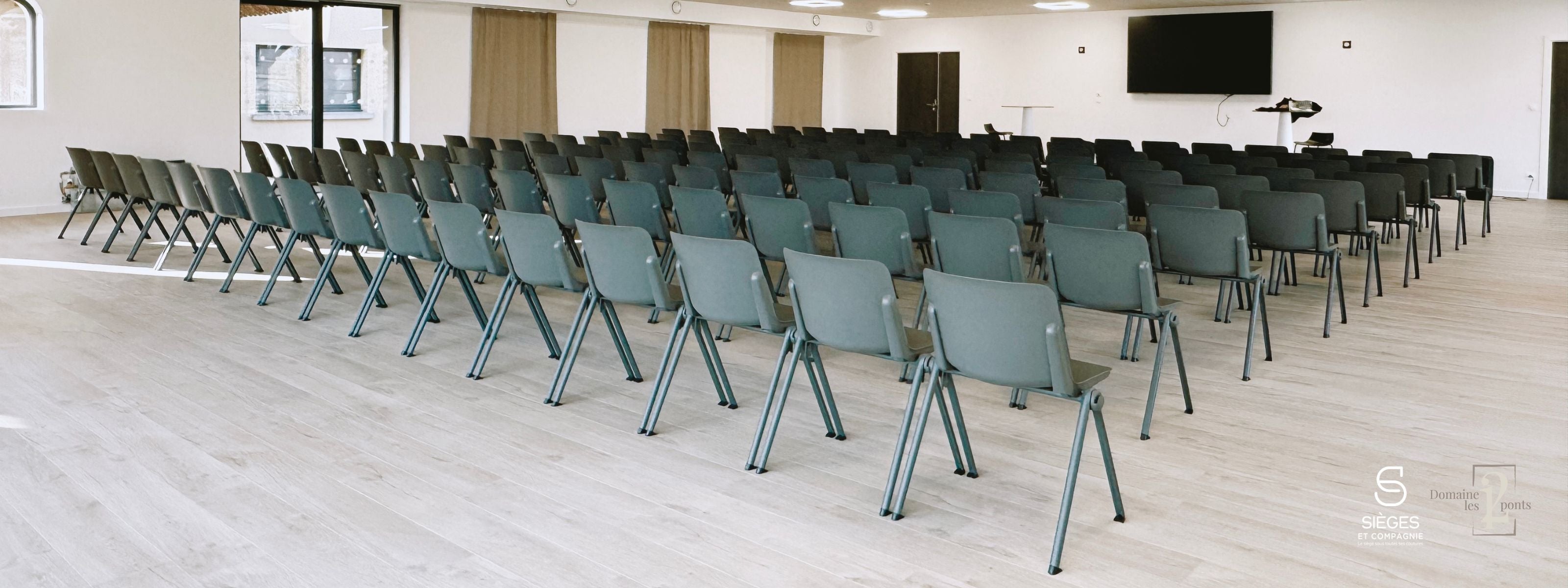 Pour répondre aux besoins du Domaine Les 12 Ponts, nous avons sélectionné des sièges empilables pour plus de flexibilité, des fauteuils lounge pour les espaces de détente, et des tables de réunion adaptables au design naturel et épuré.