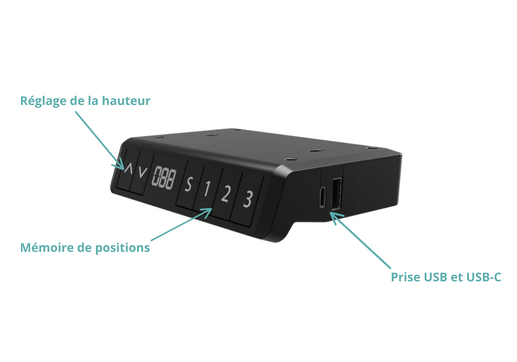 - Bureau réglable en hauteur avec système de mémorisation de position (3 positions)