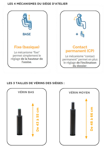 Adapté pour une hauteur de plan de travail de 72 à 83 cm - Vérin bas : Hauteur du siège réglable de 43 à 55 cm.