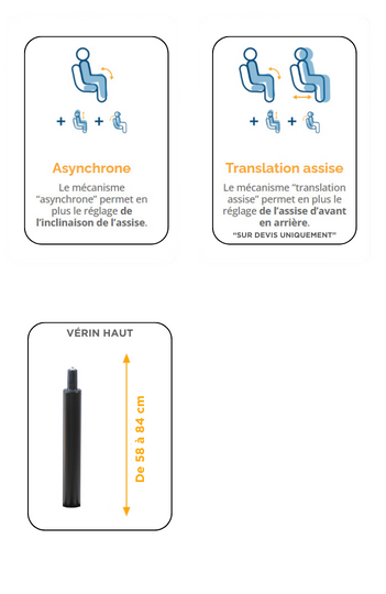 - Verin haut : Hauteur du siège réglable de 58 à 84 cm.